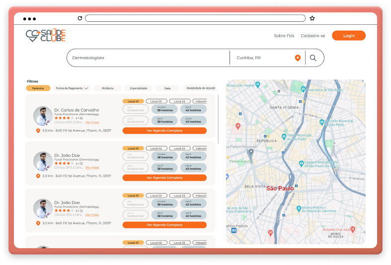 The challenge was to create a platform to facilitate access to healthcare appointments and procedures for patients and promote access for those with limited financial resources. Based on market research and interviews with healthcare professionals and patients, we created the startup Saúde Clube, including its name, identity, positioning and market differentiation, marketing and sales strategies, including launch and expansion, general communication materials, offline and online media plan, paid and organic traffic, system design and development, and monetization formats. The SaúdeClube platform integrates healthcare professionals to serve patients in person or online, allowing everyone to schedule appointments and procedures quickly and easily, securely. For professionals, it is an indispensable resource for organizing their schedules, patient care, and their financial flow.
